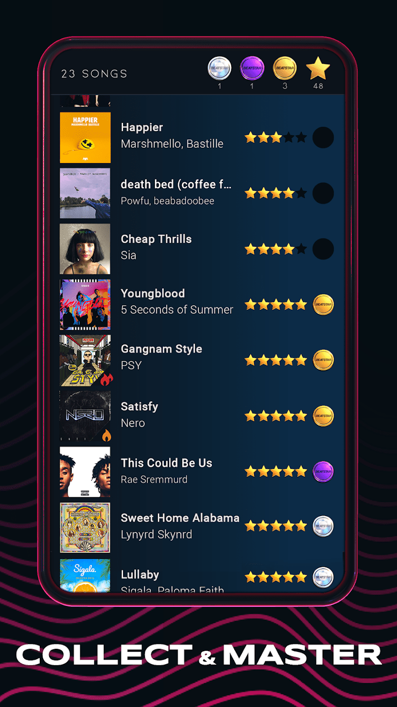 Beatstar is a rhythm-based game that combines popular music with tap gameplay. Players must tap, swipe, and hold along to the beat of a variety of songs spanning different genres. The game offers an expansive library of tracks, which keeps the experience fresh and exciting. The dynamic gameplay is challenging but fun, especially for fans of rhythm games. The visuals are vibrant, and the intuitive controls make it easy to pick up, but mastering the harder levels requires practice. Overall, Beatstar is perfect for music lovers who enjoy fast-paced, challenging games.