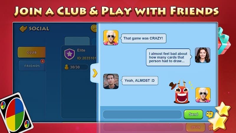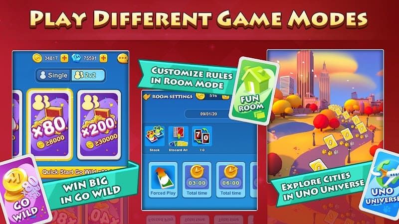 UNO!鈩 is a digital version of the classic card game, offering players the chance to enjoy the game with friends or against AI opponents. The gameplay follows the familiar rules: players try to get rid of all their cards by matching them to the top card of the discard pile, using special action cards like Skip, Reverse, Draw Two, and Wild.